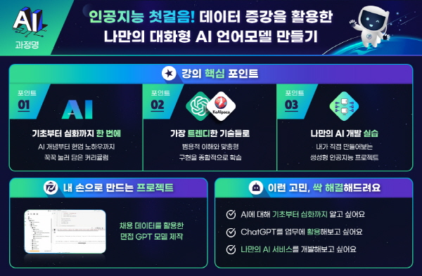 이번 협업으로 선보이는 '인공지능 첫걸음! 데이터 증강을 활용한 나만의 대화형 AI 언어모델 만들기' 과정은 AI 분야의 기초부터 최신 기술과 실무 노하우를 담아 구성되었다. AI에 대한 기초이론부터 ChatGPT를 활용한 대규모 언어 모델 개발 실습까지 실무에서 활용 높은 내용들로 구성되었으며, 과정 개발 시 안창남 AI 리더를 포함한 교보DTS의 전문 인력들이 참여해 내용과 구성의 체계성을 더했다.