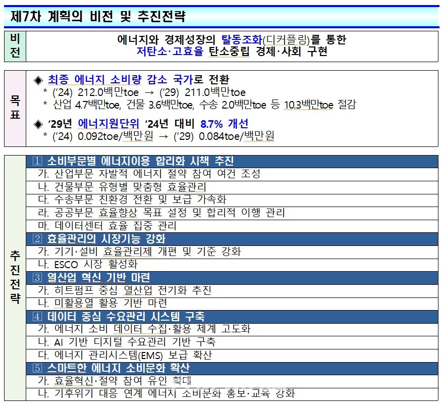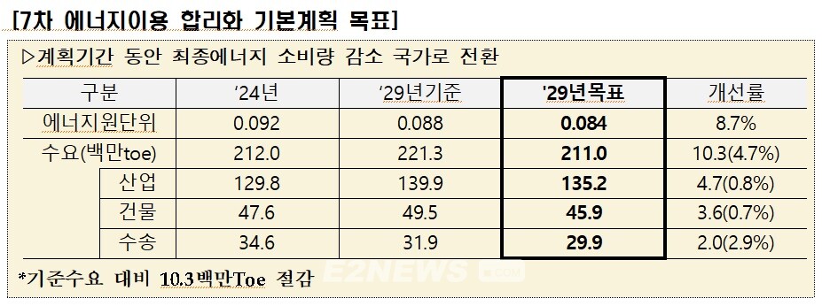 7차 기본계획을 통해 정부는 향후 5년 내 최종에너지 소비량을 감소 추세로 전환하겠다고 선언했다. 지난해 2억1200만toe까지 증가한 소비량을 오는 2029년 2억1100만toe (기준수요대비 1030만toe 절감) 수준으로 줄인다. 아울러 2029년 에너지원단위를 0.084toe/백만원으로, 2024년(0.092toe/백만원) 대비 8.7% 개선하는 목표를 제시했다. 이전까지의 에너지원단위 연평균개선율 0.9%의 2배인 연간 1.8%씩 개선한다는 계획이다.